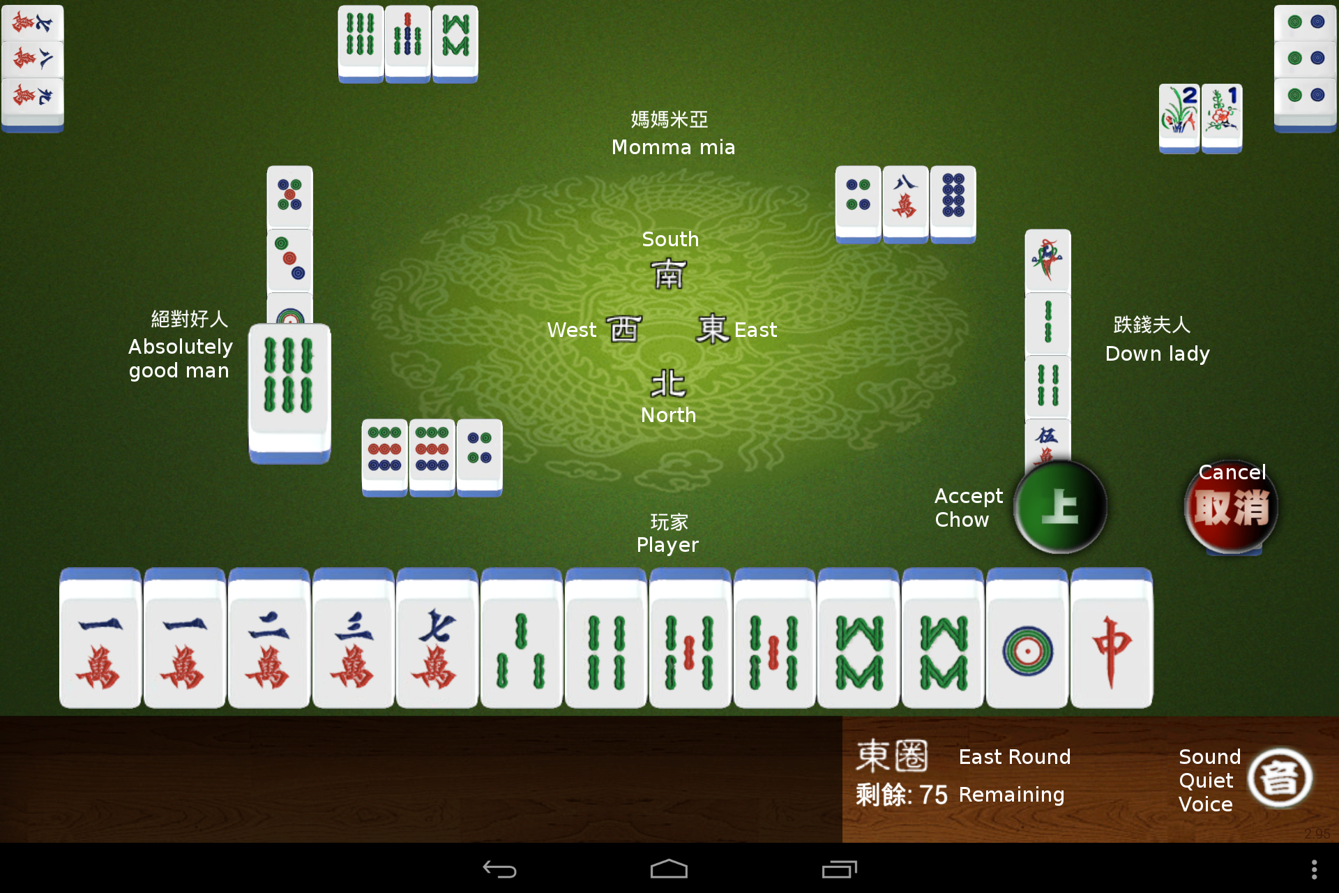 At the bottom right is the summary information, with the wind of the current round and the number of usable tiles remaining in the wall. There is also a control for the sound settings, which toggle the same three states as the Start Page, Sound & Music, Quiet, Voices Only. Sound & Music is the active setting displayed here.